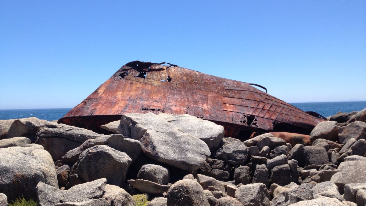 Wir sind wieder zu einem Spaziergang mit Kollegen aufgebrochen. Mit dem Auto ging es nach Sandy Bay von wo aus wir zunächst schön über Steine und Felsen geklettert sind, bis wir den etwas leichteren Pfad weiter oben gefunden haben. Nach einer guten Stunde sind wir auf der Halbinsel Oudeschip Peninsula und dem eigentlichen Ziel, dem Schiffswrack der Harvest Capella, die hier 1986 gegen den Felsen geknallt ist, angekommen. Dort warteten schon Gareth und seine Frau, die es etwas genauer mit der Zeit genommen hatten als wir, was bei der Sonne, auch ziemlichen Sinn macht. Schon lustig, dass die eher dunklen hier immer den Blocker Stufe 50 auf der Haut tragen und ich es mit ’ner soften 20er probiere – irgendwie muss ich ja braun werden!