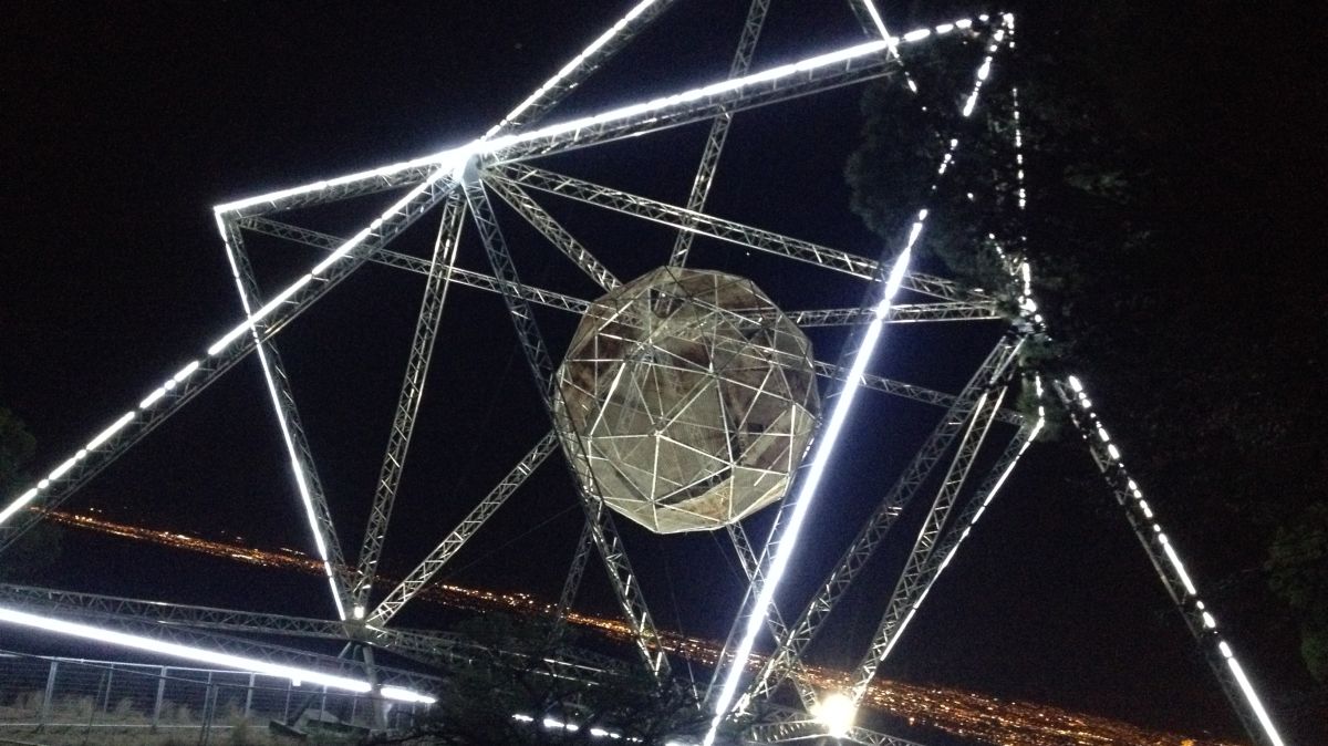 Die über 20 Meter hohe Installation ist bereits tagsüber über gut zu sehen und strahlt im Sonnenlicht wie eine überdimensionierte Diskokugel aus. In der Nacht leuchtet sie strahlend hell und schaut aus der Nähe betrachtet, wie E.T.’s Mutterschiff aus.