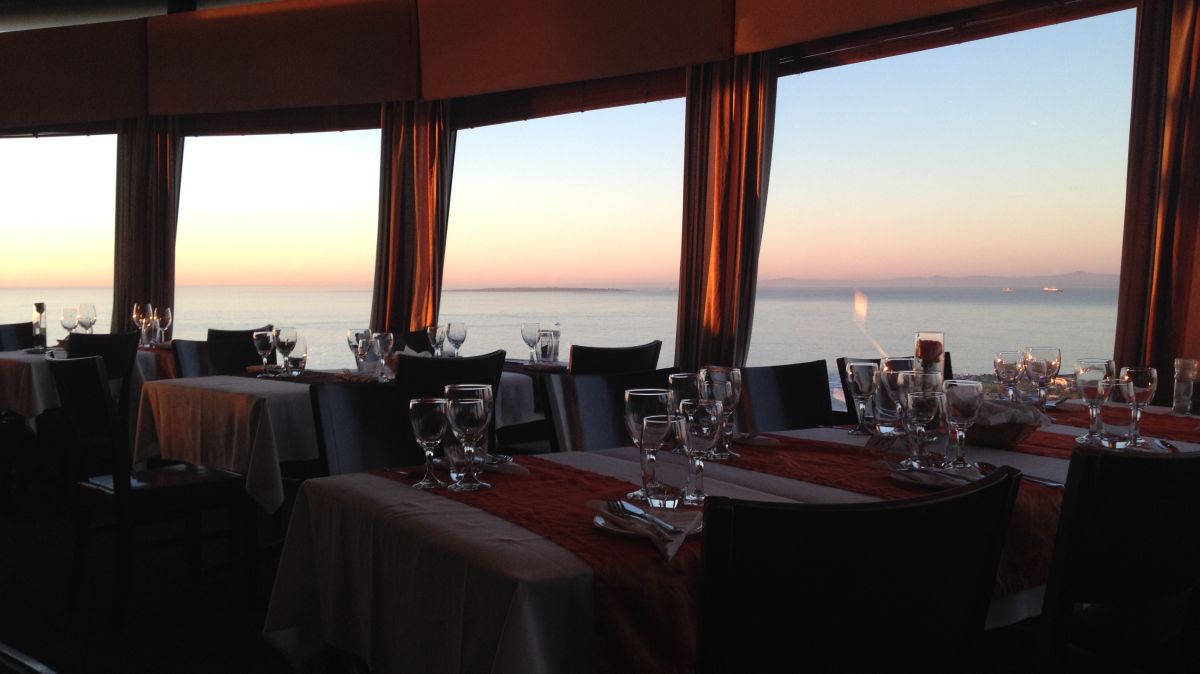 Drehendes Restaurant auf dem Dach des Ritz, Sonnenuntergang, Wein (Pinotage), Sekt, Kudu und Gemsbock, Crème brûlée, Crêpe Suzette