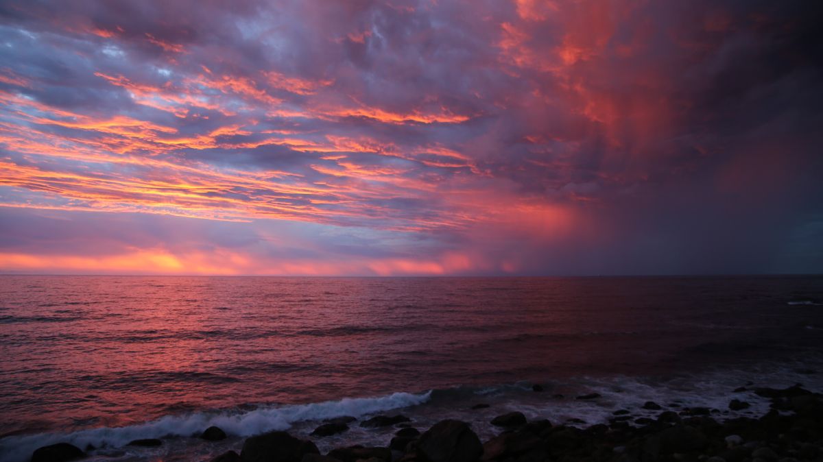 - rotes Licht kommt durch die Wolkendecke, der Himmel wird in ein immer intensiver werdendes magisches Leuchten gefärbt