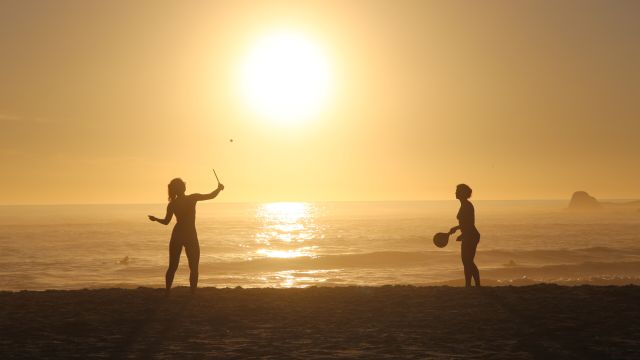 Zwei Frauen spielen im goldenen Licht der riesigen untergehenden Sonne Beach-Tennis am Strand
